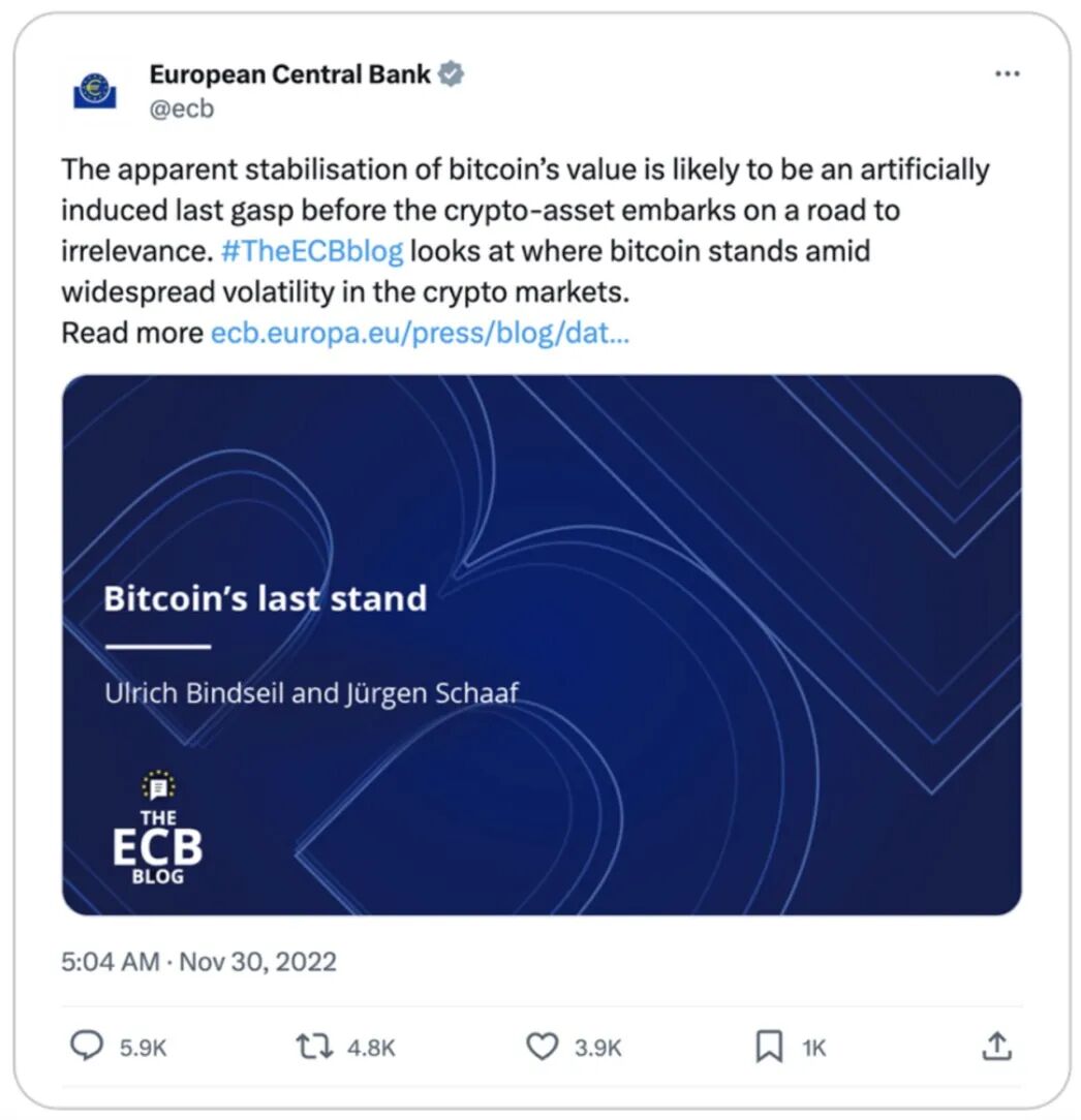 整整一年前,欧洲中央银行发布这条并不那么有先见之明的推文,呼吁比特币在逐渐「无关紧要」之前度过最后时刻。