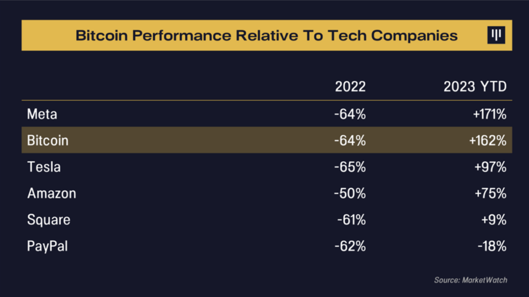 去年,比特币价格与这些科技公司同步下跌。今年,它的表现大大超过大多数公司。