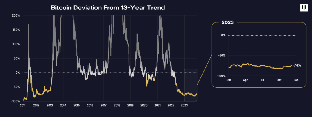 因此,即使我们正在经历反弹,也无法改变比特币相对低估的状况。下面是比特币与13年趋势增长率偏差图。即使在反弹之后,它仍然比趋势便宜74%。
