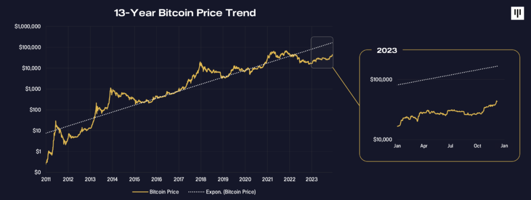 放大比特币对数趋势图,你可以看到2023年反弹只是正常现象--黄金线几乎没有超过13年趋势。
