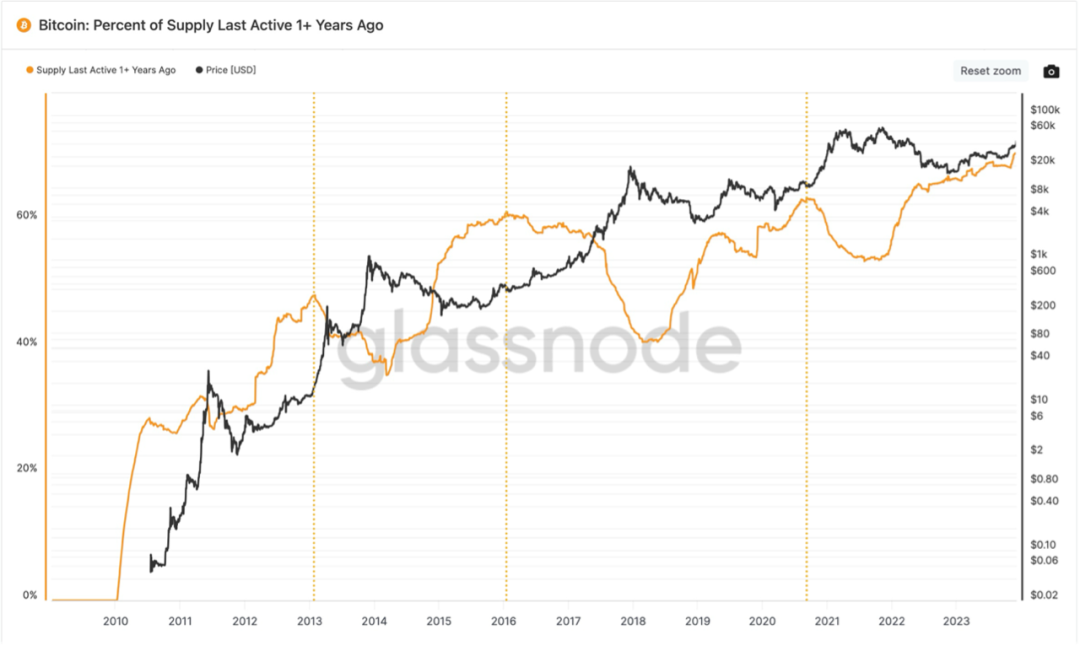 1 年期 HODL 波动可以帮助我们回答这个问题。它追踪的是至少一年内没有从一个钱包转移到另一个钱包的所有比特币的百分比。题外话:「HODL」是「Holding On for Dear Life」首字母缩写,源于2013年一位社区成员在比特币论坛上发帖时拼错了「hold」。