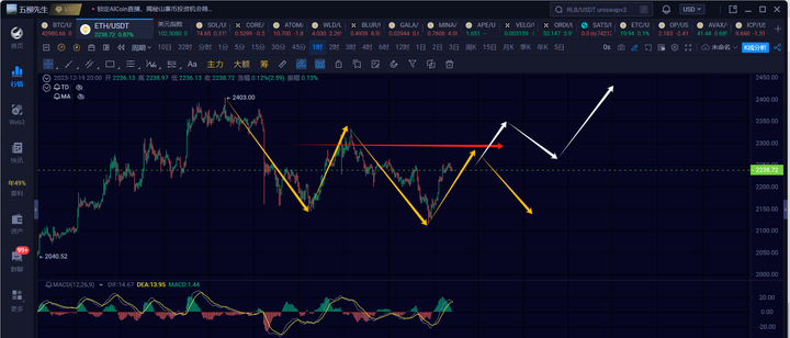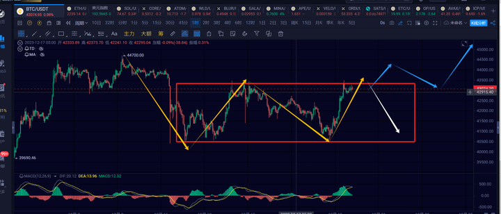 那其实就是观察了,短线如果能够有效站稳了43500,插针不算,那就可以看一笔新的4h级别的反弹,前高44700就有望再次突破。如果没站稳,当前或许还会继续在中枢震荡甚至延伸4h下。