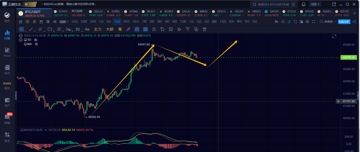 15分钟级别:方向向上,当前保持在42500上方的话,还能再走一笔15分钟上去测试43500