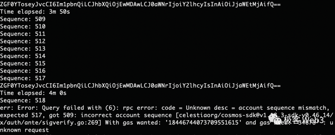 Sequence只在每次泛洪周期开始前,拉取到本地,不必像CosmJS库默认的那样,每次交易后都向节点重新请求一遍sequence。而chainId则写成固定的值,不必反复向节点请求。(编者注:这里的循环次数设置的比较低,显然作者还没那么暴力。某人在打Conflux铭文时,曾将每个周期的循环次数改为1000,每分钟差不多发出去200笔不同的交易)