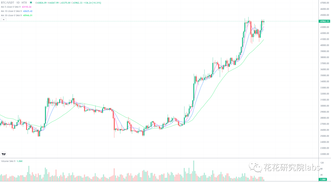 回到今天的盘面,比特币连续三天向上冲击都没有成功,留下小小上引线,前高附近的抛压还是挺大,预计短期不太好突破前高,这两天马上就是圣诞节了,很多人说会砸盘,这个不是判断行情的依据,如果你担心可以自行减仓。花哥个人观点,比特币在4万以上就是安全的,前高附近如果横而不跌,后续突破的概率会加大。