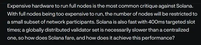 「对 Solana 最常见的批评之一是运行完整节点所需的昂贵硬件。由于运行完整节点的成本较高,节点的数量将受到网络参与者的限制,仅限于少数一小部分。Solana 的目标槽时间为 400 毫秒,而全球分布的验证器集合相对于集中式验证器而言速度较慢,那么 Solana 的表现如何,它是如何实现这样的性能的呢?」