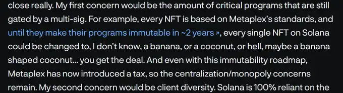 「我的第一个担忧是仍然由多重签名(multi-sig)控制的关键程序的数量。例如,每个 NFT 都基于 Metaplex 的标准,而在它们在未来两年左右(z 年)将其程序变得不可变之前,Solana 上的每个 NFT 都可能被更改为,比如说,一个香蕉,或者一个椰子,或者甚至是一个香蕉形状的椰子… 你明白我的意思。即使有了这种不可变性的规划,Metaplex 现在也引入了一项税收,中心化/垄断的担忧仍然存在。」