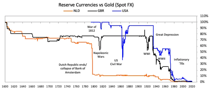 如果你认为今天的历史时刻很特殊,请看上图,展示了各种全球储备法定货币随时间变化的黄金价值。法定货币总是趋向于零。没有一个政治体系能够抵挡印钞的引诱。