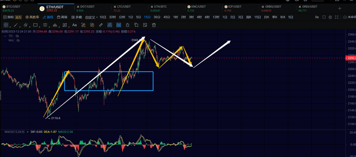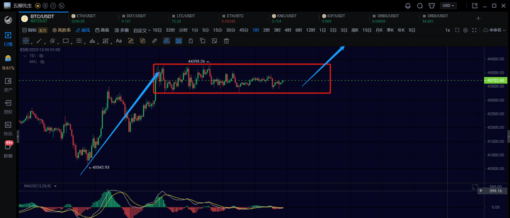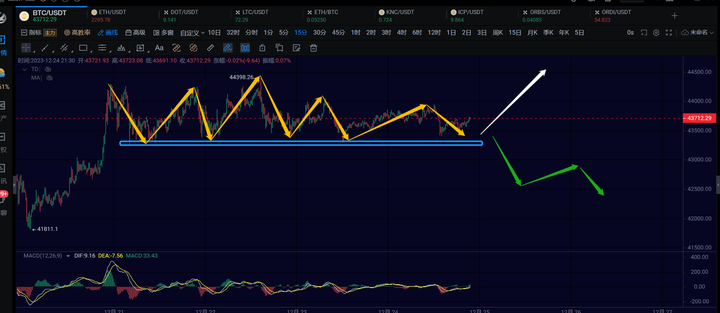 12.24日行情分析,大饼中枢震荡,下方43000不破还能再次反弹一笔