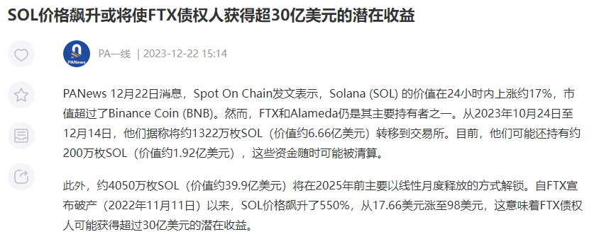 SOL是这一轮牛市铭文最大的受益者,据相关消息显示,迄今为止,FTX仍旧是SOL的最大持仓资本,至昨天为止,获利超30亿美金。