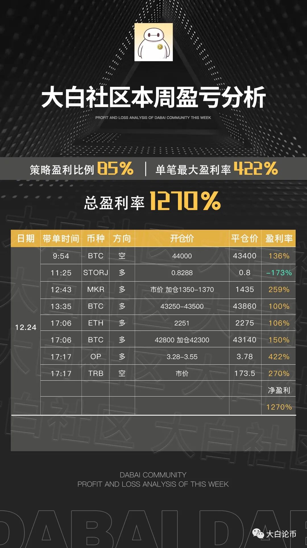 下方是大白社区本周实盘群单子,恭喜跟上的币友,如果你操作不顺,可以来试试水。