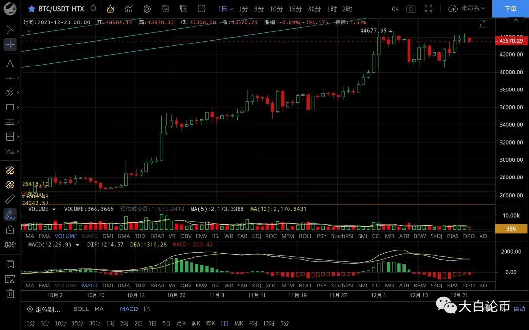 大饼昨日最高触及43943一线受阻回落,随后二次反弹未破前高再次下跌,空头发力最低跌至42530一线支撑反弹,恭喜跟上文中思路的朋友,目前币价在43130附近运行,四小时级别行情横盘后大阴回落,macd空头逐步放量双线死叉向下,k线虽收阴但空头未能延续,下方受ma90均线支撑反弹,四小时若能站稳43000则还有反弹空间,日线级别整体呈高位震荡,高点逐步降低,短期冲高的概率不大,关注回踩力度,关键支撑不破依旧看多头上涨,日内思路建议高空低多对待,上方压制43500-44000,下方支撑42800-42300
