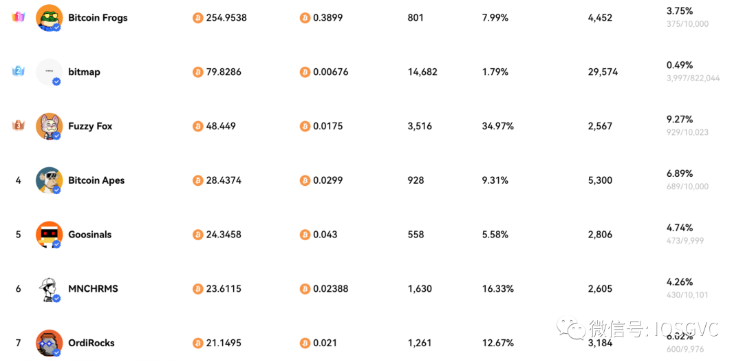 对于Ordinals NFT,我们对比其30日成交数据和7日成交数据,可以发现,项目的波动性较大,交易量前十的项目在一个月内的交易分布不均,在FOMO的时间段内换手率高,但进入平静期后流动性较差。