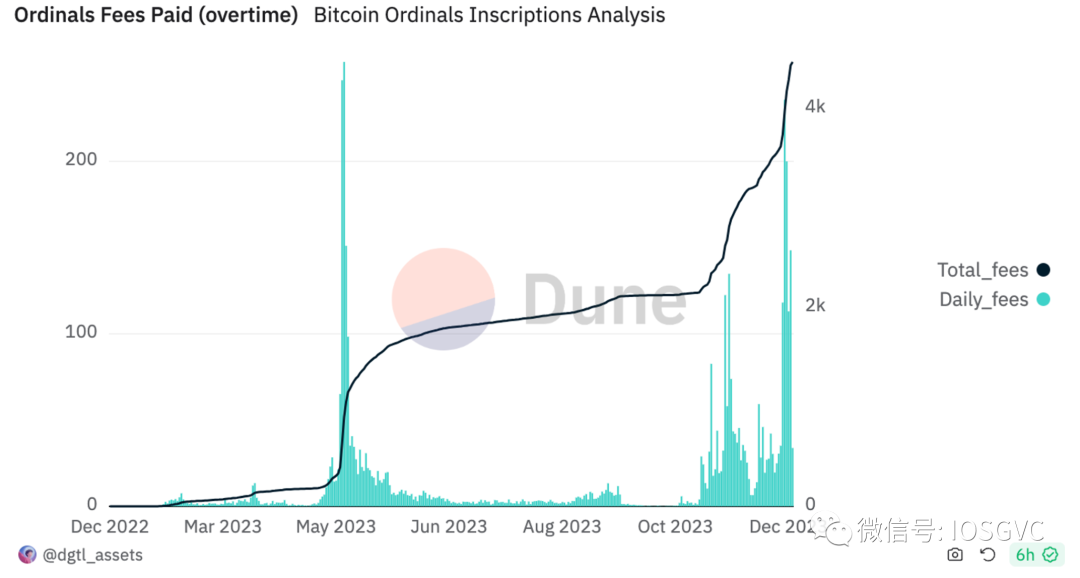 对矿工群体来说,比特币减半在即,出块奖励的激励减少,Ordinals使链上交易费用增加自然是符合其利益诉求。自年初Ordinals上线比特币主网以来,铭刻的手续费已经超过了四千个比特币。