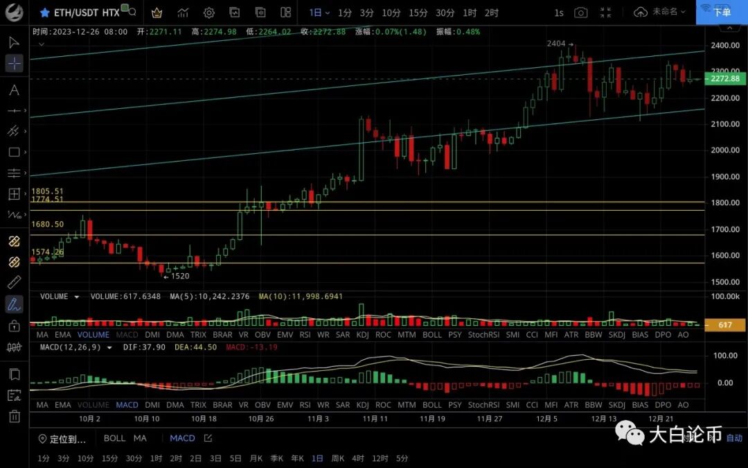 以太坊昨日震荡上行最高触及2305一线后再次回落,低位跌至2256一线支撑,恭喜跟上昨日思路的朋友空单获利50点,目前币价在2270附近运行,四小时级别行情再次反弹未破前高,整体呈震荡回落走势,短期受ma14均线压制无法突破,macd空头运行双线死叉向下,行情反弹力度薄弱短期走势偏向空头,日线级别高点逐步降低有再次试探ma30均线支撑的需求,破位则会去ma60附近,不跌破2100依旧是多头趋势,思路不变逢低做多为主高空为辅,上方压制2300-2340,下方支撑2250-2200