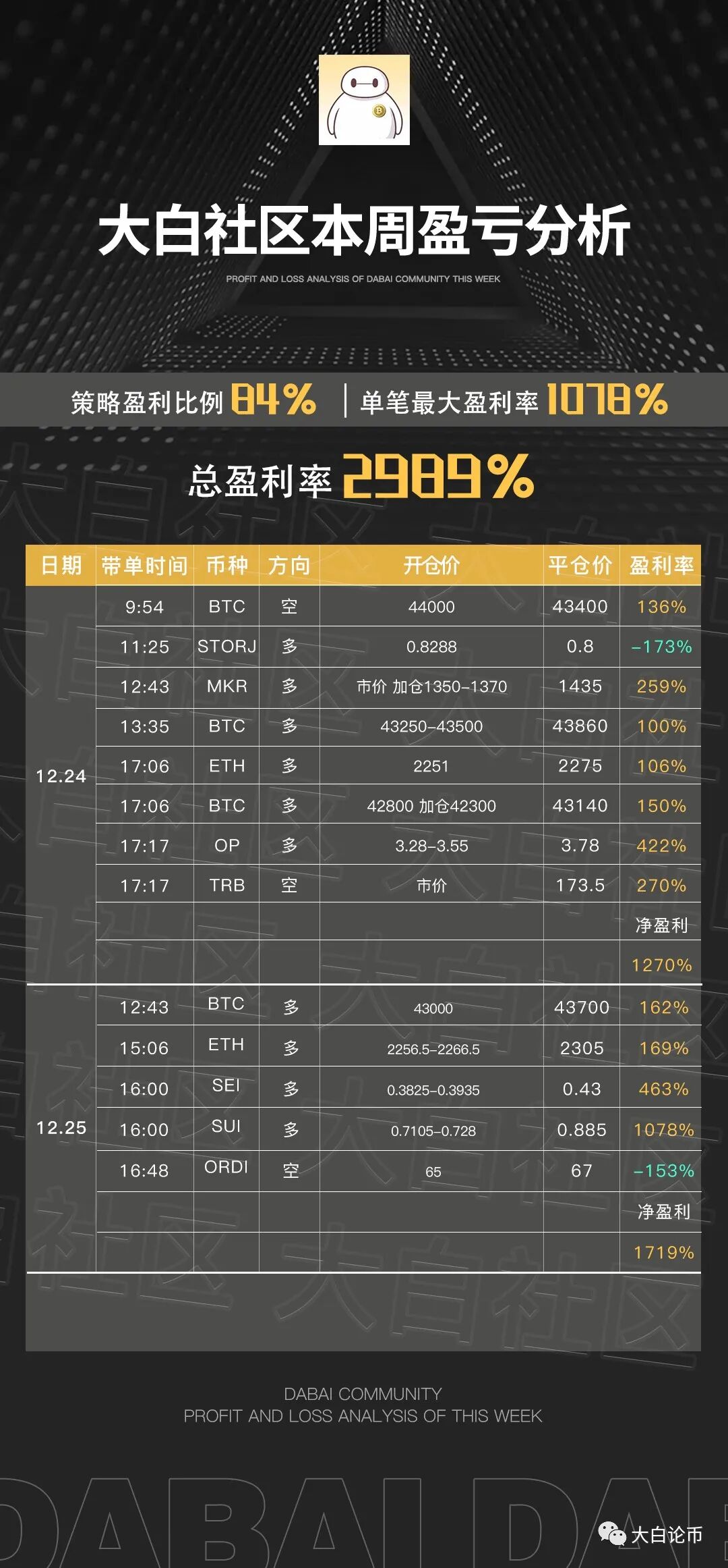 下方是大白社区本周实盘群单子,恭喜跟上的币友,如果你操作不顺,可以来试试水。