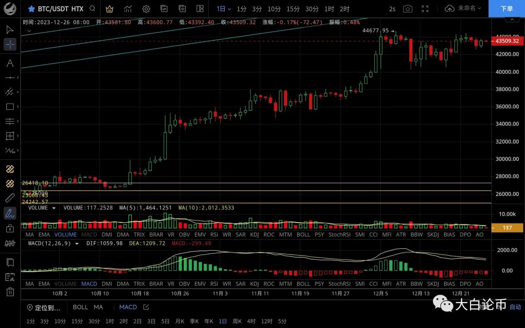 大饼昨日整体呈震荡上行走势,期间价格回踩至43000附近止跌再次反弹,最高触及43800附近受阻回落,恭喜跟上昨日思路的朋友,目前币价在43440附近运行,四小时级别行情止跌反弹拉回起跌点,可见多头支撑力度挺强,macd空头减弱双线死叉状态,短期行情反弹受阻有回落需求,关注ma7支撑情况,若破位则还有下行的需求,日线级别k线收十字星阴线但回踩力度预计不会太大,高位震荡后行情预计会再度迎来走高,低多的单子可继续持有,思路建议逢低做多为主高空为辅,上方压制43800-44400,下方支撑43400-43000