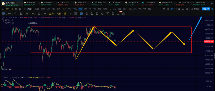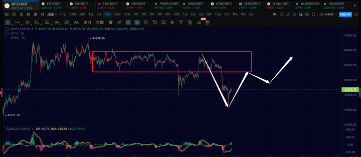 短线这里看42000附件的支撑,这里有可能要走一笔1h级别的反弹,如果成功走出来了,上方关注44000即可。