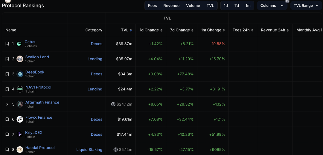 如下图,Sui的TVL和生态应用,最大前两个TVL:应用一个是dex,一个是借贷。