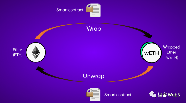 WETH是一种ETH的ERC20等价物。Ether作为主币,很多dApp中的复杂功能是无法实现的,因此需要一个ERC20的等价物。向WETH合约内转入一些ETH,它们会被锁在合约内,并生成出相同数量的WETH。