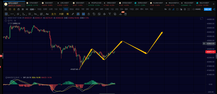 15分钟级别,中午的回踩力度不大,没有创新的低点,这里有希望走出一笔1h级别的反弹。如果能够成功突破42800,则确认为1h级别的反弹,反弹目标关注43500附近。重新跌破42000则认为1h回调可能还需要再次延伸一下。