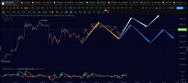 15分钟级别,这里42800附近稳住的话,应该还要再走一笔15分钟级别的反弹,上方先看44000附近的阻力情况。