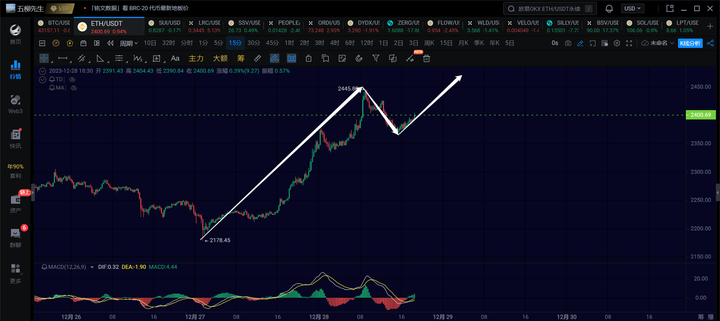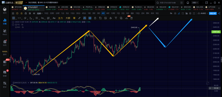 以太4h级别,这里4h级别的反弹成功创了新高。那当前看往上的力度了,是进一步的突破2500还是突破不了要走一笔4h级别的回调构建中枢。这点我们得再观察看看。