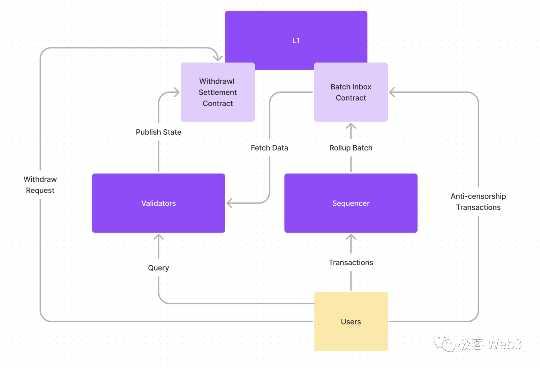共识层:由一群节点组成,它们拉取执行层提交到DA层上的数据,并用与执行层相同的算法,对这些数据进行运算,确认执行层的结果输出是否正确,并可以作为执行层的防灾冗余。用户也可以读取共识层各节点返回的数据,确保执行层没有欺诈行为。