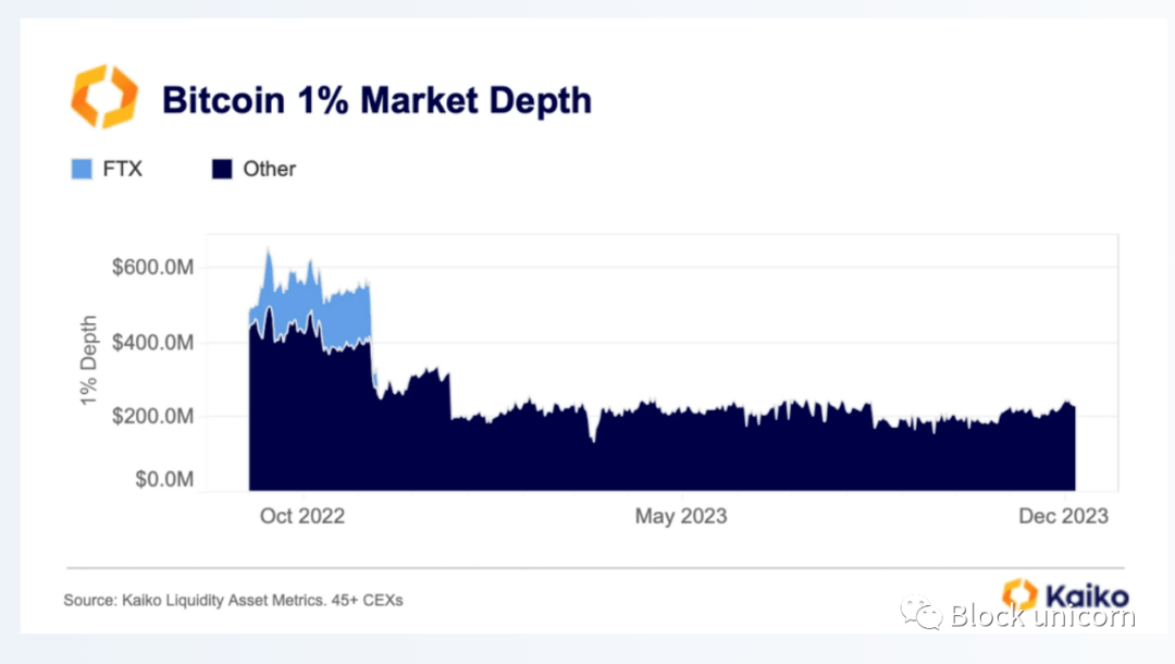 FTX的崩溃导致比特币市场深度大幅下降,不仅FTX的突然消失实质上减少了流动性,而且由于巨额损失和困难的市场环境,市场做市商还在许多交易所上关闭了头寸。1%市场深度,即在价格1%范围内订单簿上的买卖数量,已经从在所有交易所和交易对中约为580亿美元下降到仅约230亿美元。