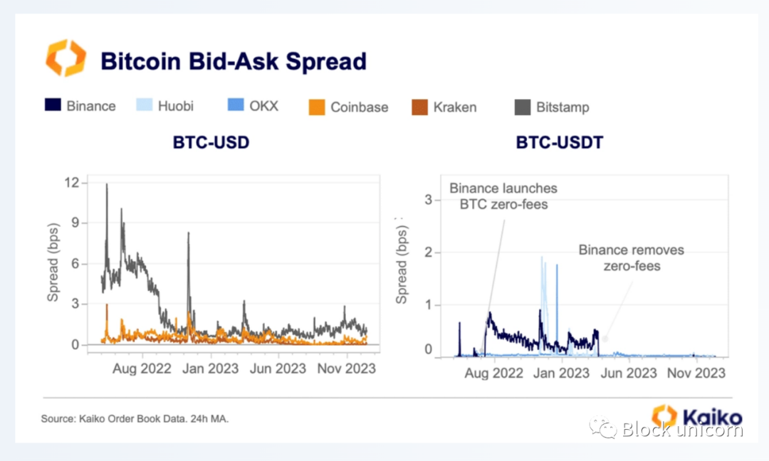 ETF的批准还可能影响交易成本,因为更多知情的投资者进入比特币市场。在过去的一年中,交易者的成本,以点差的形式,自去年以来大多有所改善,可能是由于价格波动较低。