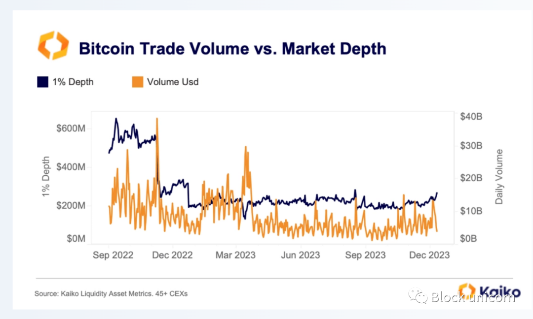 在ETF的背景下,为什么市场深度很重要呢?ETF发行者将需要买卖基础资产。虽然尚不清楚他们将在哪里进行这项交易——是在现货交易所、场外交易,还是从矿工手中购买——但有可能在某个时候,集中式现货交易所的流动性将增加,尤其是因为许多ETF预计将一次性获得批准。