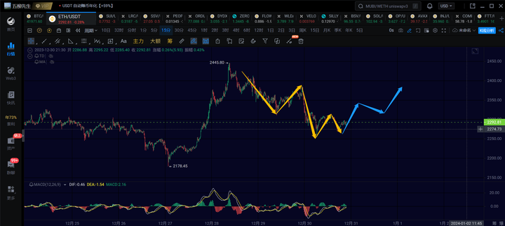 以太昨天今天已经走出了一笔1h级别的下跌,短线这里看是否突破2315,如果能够突破可以看1h级别的反弹到2400附近。如果到不了2315,需要注意可能会往下延伸到2230附近然后走1h反弹。