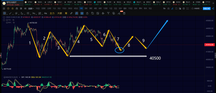 这就不太好判断了,只能说跌破40500,那看一笔日线回调,完事再走一笔日线级别的反弹。保持在40500上方,依然可以震荡差不多后继续创新高来延伸日线一笔反弹。