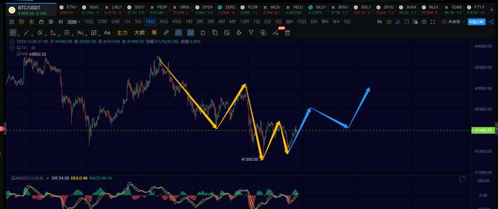 15分钟级别,这里需要观察下,看短线能否到42500,如果能到的话,可以看一笔1h级别的反弹。若短线这里反弹到不了42500,那需要注意继续往下延伸去40700~41000附近。1h级别的反弹可以关注43000附近。
