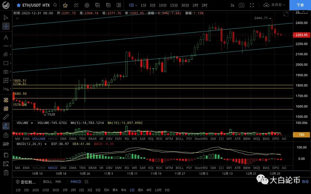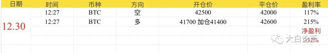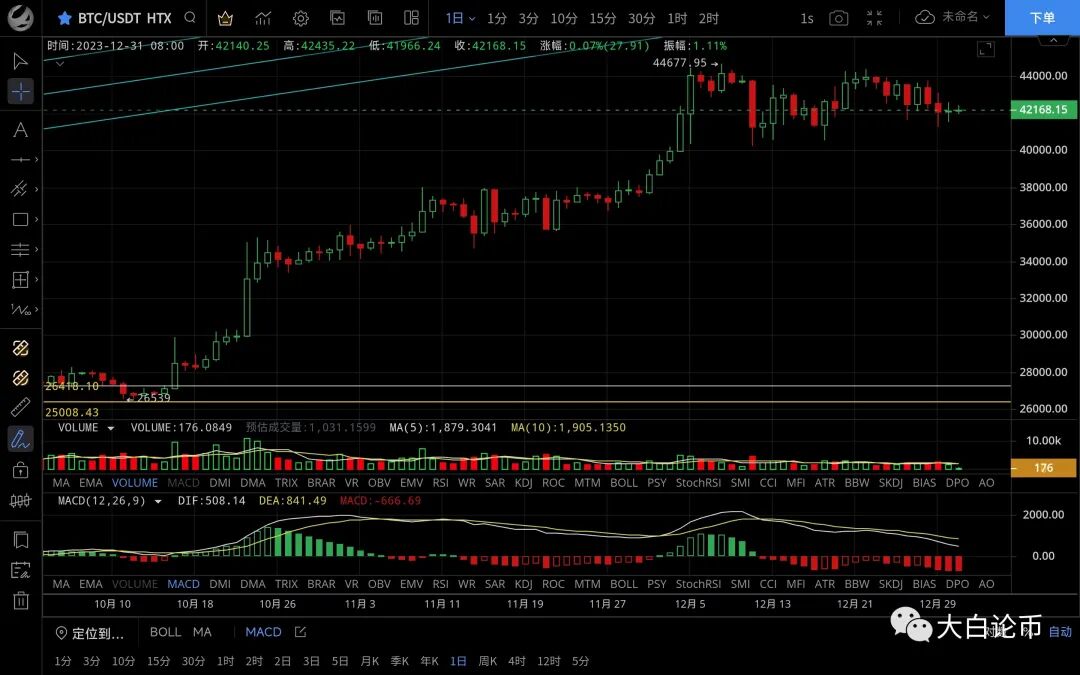 大饼昨日早间最低跌至41260一线支撑反弹,期间二次回落未破前低,行情一路上行最高触及42600附近承压回落,恭喜跟上低多思路的朋友获利1000点,目前币价在42110附近运行,四小时级别行情多次下打ma200均线都未有效跌破走出反弹,上方整体承压于ma30下方,短期k线连阴下跌,活动空间逐渐变窄,macd无量运行双线粘合,周末波动不大预计会持续窄幅震荡,日线级别整体呈震荡走势,高点逐步降低,macd呈空头死叉状态,短线偏向空头,但下方支撑较为强劲,加上年末变数较大,且记带好止损,目前思路建议高空低多对待,上方压制42500-43000,下方支撑41500-41000
