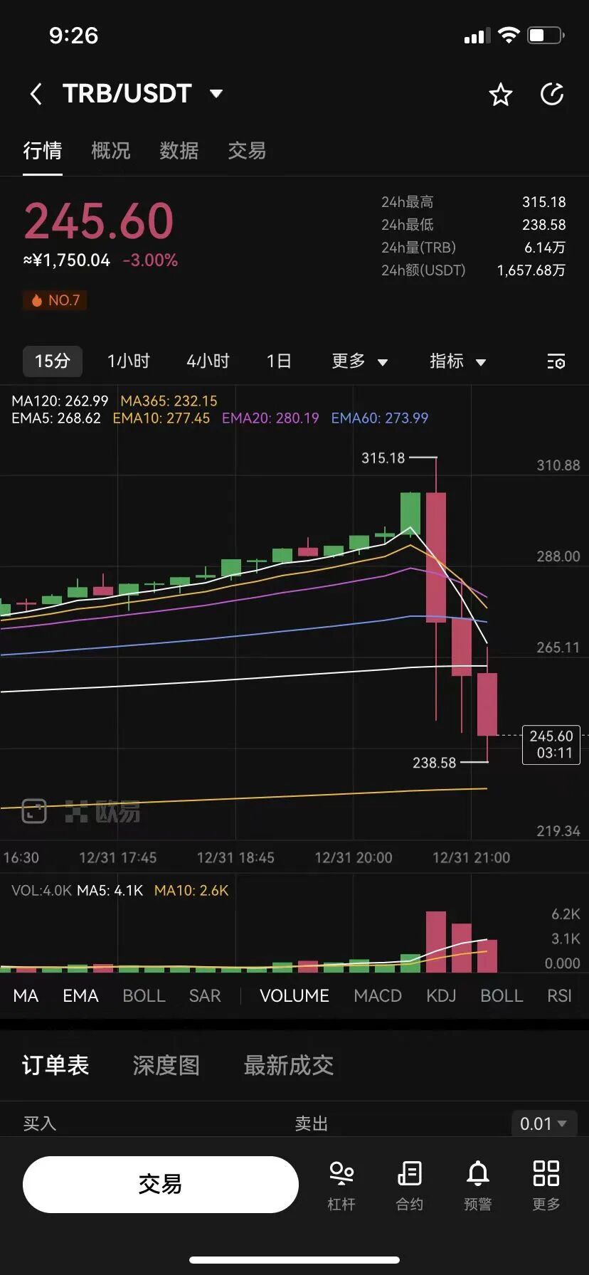 刚才TRB发生了惊魂一幕,今天本来已经有10几点涨幅达到历史新高270多的时候,突然又爆发,往上拉跟针,刺破300,然后接下来的几分钟不到,又快速跌到250以下,合约更狠,竟然针到了220左右。