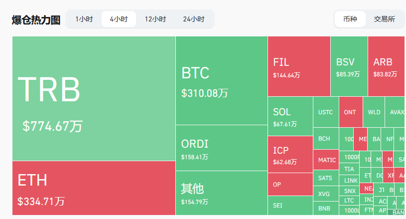 这一涨一跌之间,不管是做多的,做空的,只要没设止盈止损,基本上都是爆仓,4小时爆仓热力图,TRB也力压了大饼以太。