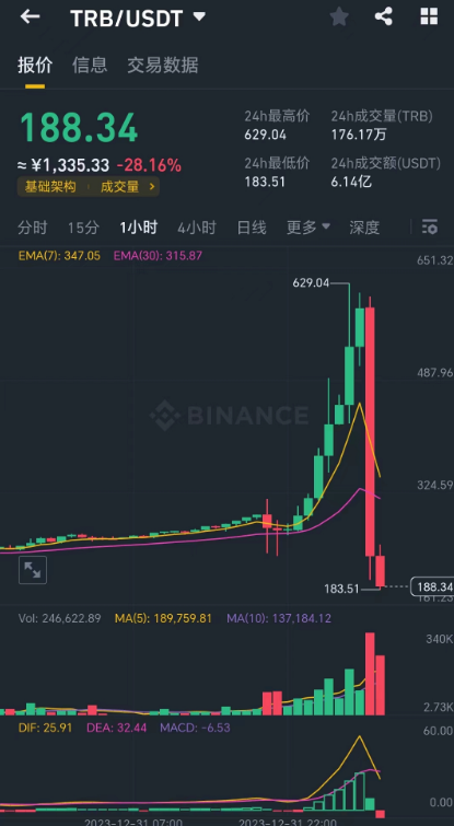 就在昨晚,连续涨了4个月TRB,昨天从100刀暴涨至300多刀,然后又快速暴跌至200刀附近,大行收割之举。我相信很多韭菜会认为,这也许就是极限了,但没想到半夜又快速拉高至最高600多刀(欧意超700刀),随后开始一路暴跌至200以下。