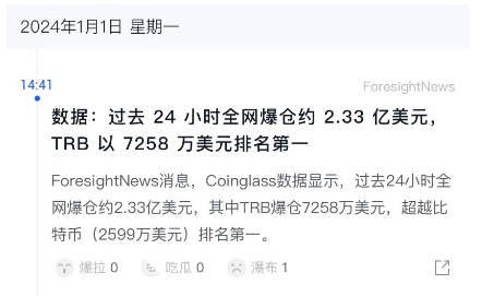 截至14点41分,相关数据显示,过去24小时全网爆仓2.33亿美金,TRB霸占榜一,爆仓7258万美金。