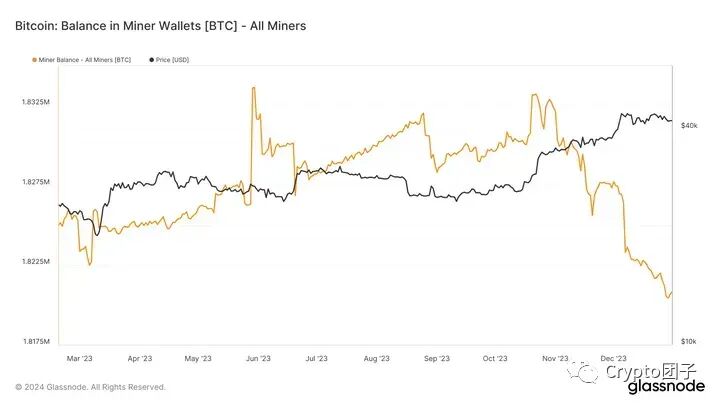 矿工也在年底前获利了结。自10月中旬以来,矿工钱包中的余额已下降约12000 BTC。
