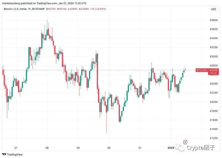 随着 2024 年的到来,比特币价格走势不像新年一样火热,比特币在震荡的价格区间里迎接了新的一年。