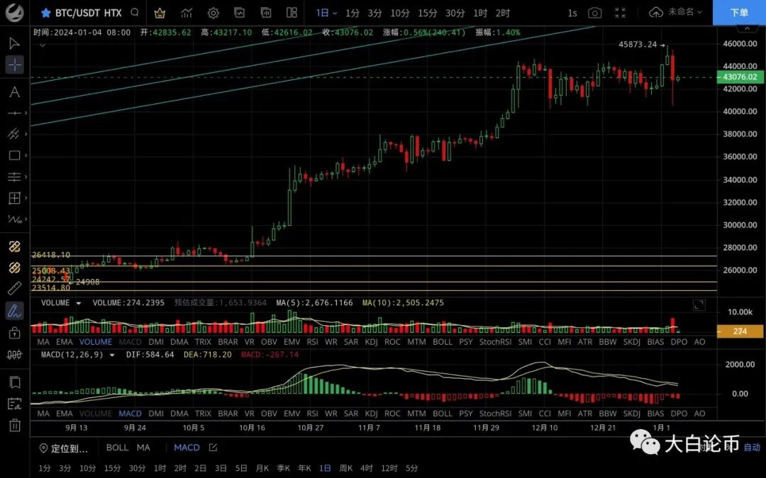 大饼昨日白盘波动不大,直到晚间受消息面影响走出一波瀑布,最低跌至40500一线支撑反弹,目前币价在43050附近运行,技术面来看虽下跌5000余点,但40000关口始终没有破位,个人依旧是看好多头,四小时级别k线收针反弹,再次回到43000上方,macd虽呈空头但下跌力度不大,整体呈在ma200上方运行,可见多头比较强势,前期文中提及只要4w不破回踩就是机会,恭喜跟上思路的朋友目前大赚近3000点,日线级别多头依旧强势,后市个人更看好突破上攻,日内预计会走震荡修复,思路建议高空低多对待,上方压制43500-44000,下方支撑42500-42000