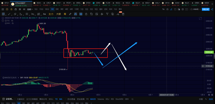 以太也是一样的,这里首先是盘整了一个15分钟级别的中枢,短线看是白色路线还是蓝色路线。白色路线是再次向上去2250~2300附近完成1h级别的反弹,然后走一笔1h级别的下跌。蓝色路线是先跌破2188后回踩2100附近,完成1h级别下跌的延续,之后再走1h级别的反弹。