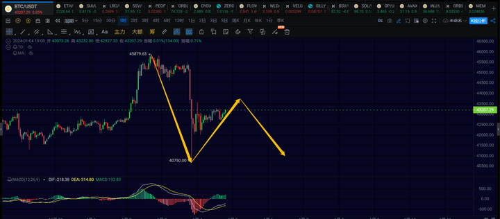 4小时级别:偏震荡,严格来说4h级别的反弹实际是没有成功的走出来,这两天先关注40500~40000的支撑,不跌破的话看震荡,等消息面落地选择方向