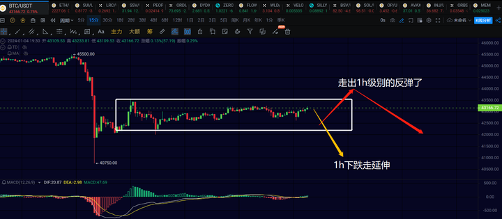 1h级别,这里考虑的是,可能会小转达走一笔1h级别的反弹,即1h的macd回抽0轴,只要价格不突破44000,则大概率还要再走一笔1h级别的下跌回踩41000附近。或者这里本身在震荡构建15分钟级别的中枢来延伸一下1h级别的下跌,出现背驰以后再走1h级别的反弹。