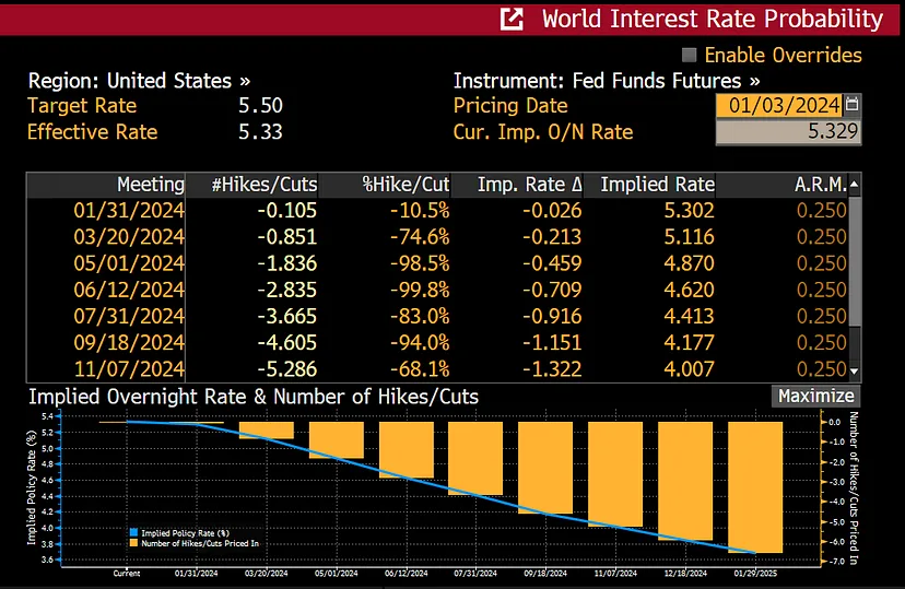 这是联邦基金期货隐含的未来联邦储备会议加息概率表。正如您所见,截至 1 月 3 日,市场定价显示有 75% 的可能性出现 0.25% 的降息。