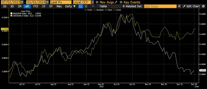白线是 10 年期国债,黄线是 10 年期和 2 年期国债收益率之间的差异。正如您所见,收益率在十月底以熊市走陡的方式达到峰值,意味着白线和黄线齐升。11 月初拉开了一场猛烈的债券空头挤压,收益率暴跌。