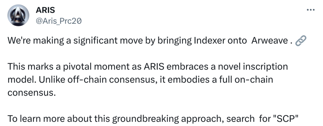 11/ 这种形式的最早提出者是永久存储服务商 Arweave,该模式被称为存储共识范式,即 Storage-Based Consense Paradim (SCP),据称,Arweave 链上首个铭文项目 $ARIS,将采用该机制,将索引上传到 Arweave,成为首个「纯链上共识」的铭文。