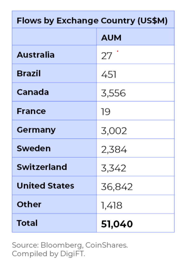 根据数字资产发行机构 CoinShares 每周统计全球各个地区合规加密资产产品的资金流动情况,数据包含各大机构发行的、投资于加密资产的、在传统金融渠道交易的产品,包括各类 ETP (Exchange Traded Products,交易所交易产品)和信托产品。该数据能够提现传统金融的资金,尤其是机构投资者资金对加密资产的投资资金进出情况,最新一期的数据截止于 2023 年 12 月 31日。其中根据交易所在地区划分,各个地区的资管规模为: