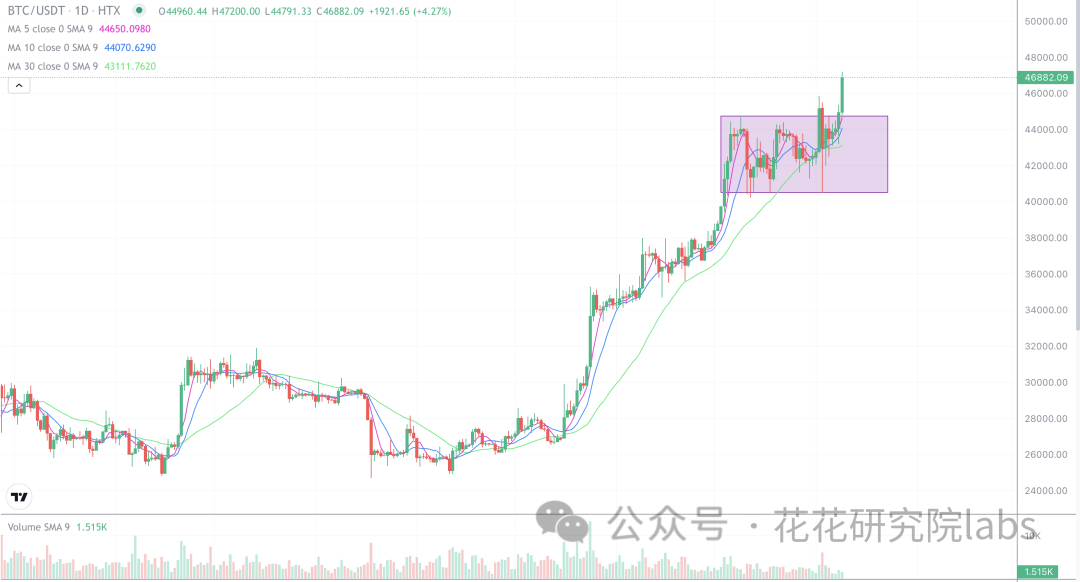 比特币的走势是符合我们预期的,我们之前判断高位震荡,然后不破40000向上突破的概率大,突破之后去冲击50000。回到今天的盘面,比特币已经强势突破,技术层面是完全可以再次看涨的,这波如果没有意外,技术层面是可以看到50000,甚至50000上方,这里唯一有影响的就是比特币现货etf,如果通过,那比特币以及比特币生态的代币会直接起飞,如果不通过,市场可能又要很长一段时间的调整了。花哥短线建议依旧是一颗红心,两手准备。做长线的就坚定持有,回调即是机会!